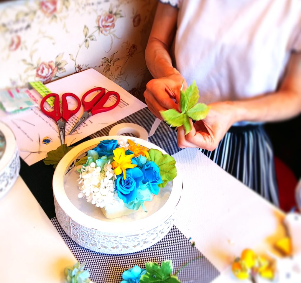 ●グリーンが大人可愛いフレーやレースの花器と夏のマリンブルーが素敵なアレンジメント~プリザーブドフラワーアレンジメントレッスン編